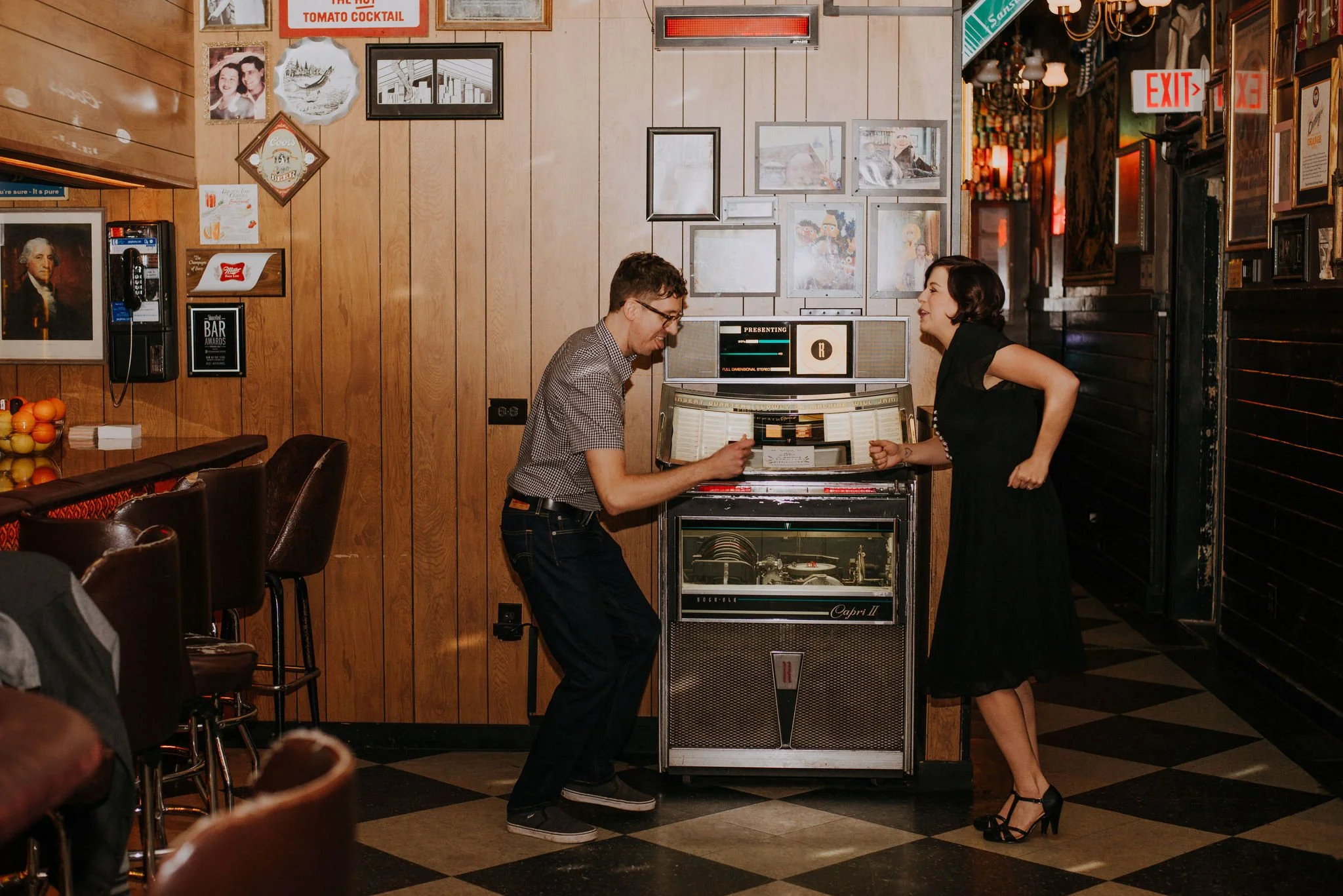 Katie and Joe wandered the rooms of Garfield Park Conservatory for their engagement session and later browsed the vast record collection at Bucket O’Blood Books and Records. They ended their date at a dive bar where they danced to the jukebox and shared a drink. They then ended the night at Logan Theater.